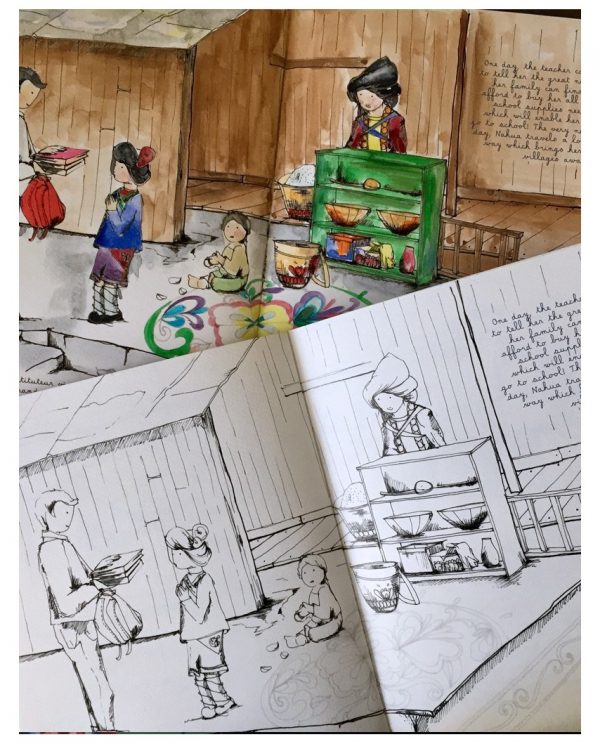 Through Nahua’s storytelling and the 9 illustrations to be colored in, you will discover the culture of the minorities from southern China. A country at the hear of  Couleurs de Chine’s action which helps the young girls from these minorities to go to school.